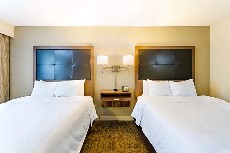 32-inch LCD HDTV, work desk, activity area, coffeemaker, free WiFi, whirlpool tub Relax in this comfortable studio suite featuring two clean and fresh Hampton beds® and a relaxing whirlpool tub. This studio features a 32-inch LCD TV with HD channels and an activity table with chairs. Catch up on business at the convenient work space and stay connected with free WiFi. Refresh in the bathroom which contains fluffy towels and a shower with a curved shower rod for added space and light. This suite also has a coffeemaker.